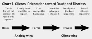 In Chart 1 you will see some possible responses to the symptoms of doubt and distress. Clients enter treatment in the position of resistance. In their most resistant position they say, ‘This is horrible. I’ll lose if this happens.” Even the stance of “I don’t want this to happen” gives anxiety the upper hand, because the mind and body will move into battle mode. Ideally, if clients can respond by saying “yes” to the encounter, and accept exactly what they are experiencing in that moment then they will be back in control.