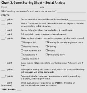 Thinking of their relationship with anxiety as a mental game offers both a broad therapeutic point of reference and specific actions that manifest it. Initially, your skills of persuasion and their belief in you will push them to challenge their faulty beliefs. After that, experience will be their greatest teacher. Once they have acted on these beliefs and gotten feedback during the fear-inducing event, that learning will put the power in their new orientation and it will be self-sustaining. They will then have a set of instructions, such as “anxiety, please give me more” or “I’m looking for opportunities to get distressed” that will point them toward simple choices during difficult times. And they will have a skill set (that I laid out in Charts 2 and 3) that they believe will match the challenge of the situation.